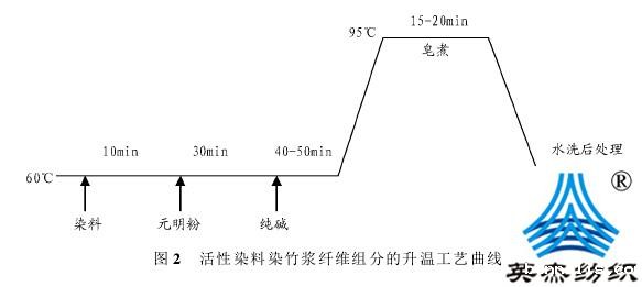 2. 4. 2 染色过程[4]由于面料为双组分混纺产品,为了达到良好的染色效果,采用了分散、活性染料二浴二步法染色。先用分散染料染抗菌涤纶,经过还原清洗之后,再用活性染料套染竹纤维组分,并使用碳酸钠进行固色反应。
