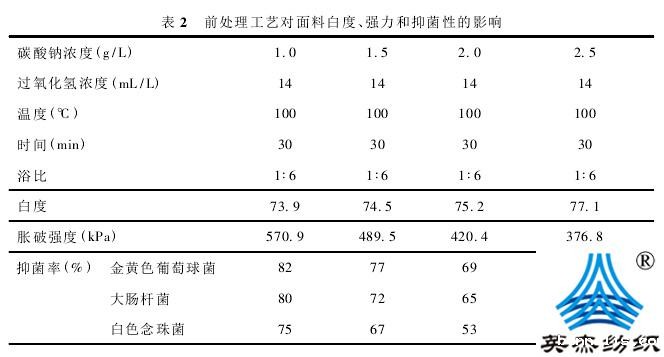 . 4. 1 中所述的煮漂工艺进行前处理,其对面料白度、强力和抑菌性所产生的影响如表 2 所示。