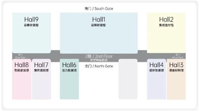 Hall1品牌软装馆、Hall2集成选材馆、Hall3墙面材料馆、Hall4整体软装馆、Hall6活力软装馆、Hall7窗饰遮阳馆、Hall8智能家居馆、Hall9品牌软装馆