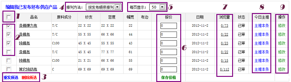 8、今日主推,在坯布现货及其他相关栏目中主推的产品,“主推”或“取消主推”;