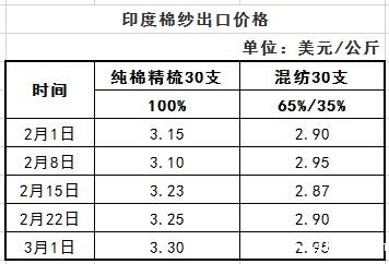 2月23日-3月1日一周,印度棉价继续上涨,棉纱价格随之上调。据统计,上周印度国内棉纱价格累计上涨1-2卢比/公斤,30S纯棉纱FOB价格上涨5美分/公斤至3.3美分/公斤,30S混纺纱FOB价格上涨5美分/公斤至2.95美分/公斤。