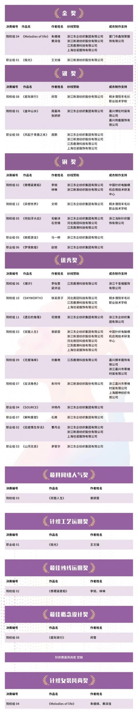 此外,今年大赛组委会还特别设立了针织工艺运用奖、针织男装风尚奖、针织女装风尚奖、佳纱线运用奖、佳概念设计奖、具网络人气奖等多个单项奖。