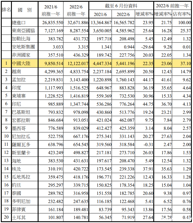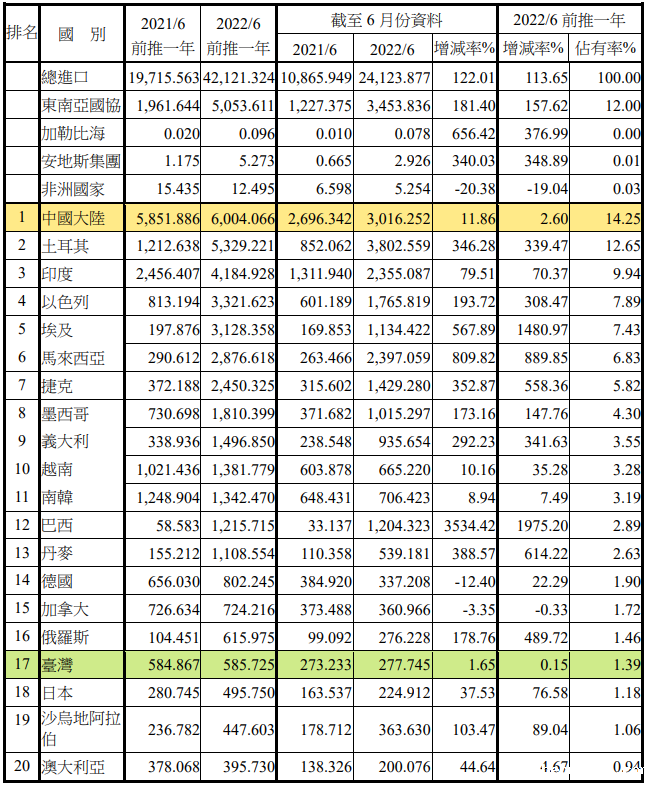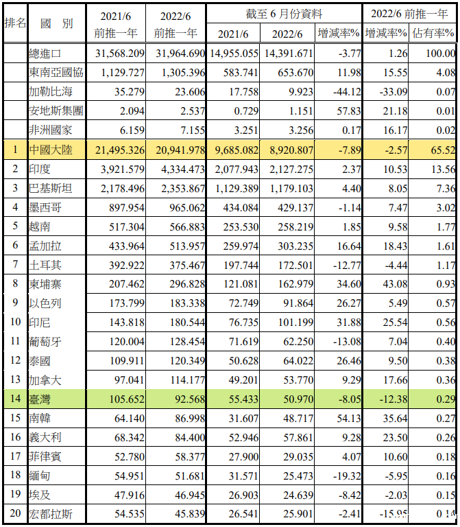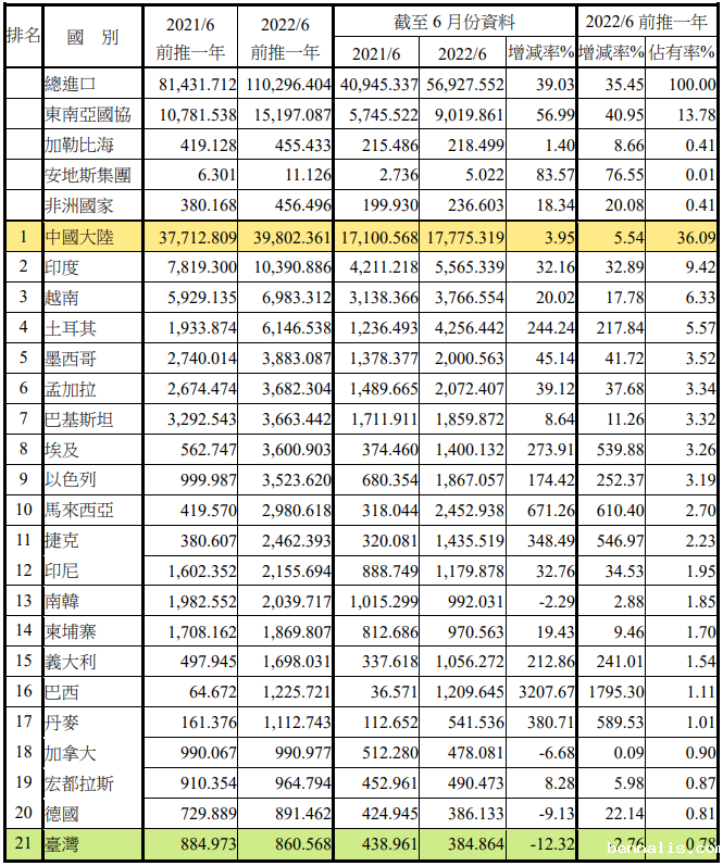 注:依2022年6月前推一年进口占有率排序