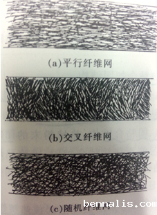纤维随机杂乱式的成网可形成随机排列纤维网。气流成网、毡化、高聚物挤出式成网、湿法成网,都具有纤维随机排列的特征。