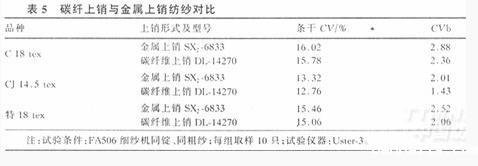 在实际生产中,我们对金属上销和碳纤上销的使用情况进行了对比,发觉碳纤维上销相对金属上销而言,其刚度、韧性较好,抗变形能力强,具有优良的自张力功能,胶圈运转稳定,成纱质量稳定;碳纤维上销的成纱质量实在要优于金属上销,其质量对比情况见表5。