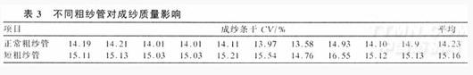 在生产实践中,由于受粗纱机型或纺纱品种的限制,在纺同一品种时可能会使用不同机型、长短不一致的粗纱管或大小粗纱交叉混用。由于长短粗纱管所纺粗纱及大小粗纱管的退绕半径不同,使其退绕张力不一致,从而造成细纱牵伸过程中握持力、牵仲力的不一致,导致影响成纱条干质量;试验数据见表3,