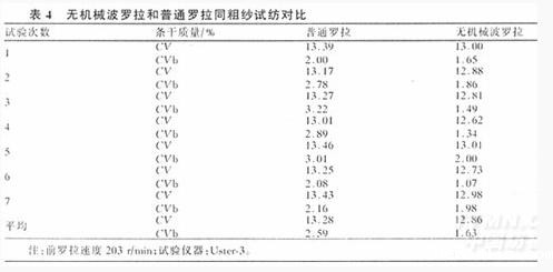 细纱罗拉是牵仲的主要部件,罗拉弯曲、扭振、跳动或运转不稳,都会造成牵仲不稳,恶化成纱条干,在波谱图上8cm%处显示明显机械波;因此,要求车间保全在平装罗拉时,要高标准、严要求、严格执行操作规程;要利用百分表逐节测定,使罗拉弯曲偏心保持在5‰以内;要严格检查罗拉轴承,损坏的要及时更换,以保证罗拉运行平稳;其它,在经济条件同意的情况下,要积极引进使用新型的无机械波罗拉,这对于降低成纱条干大有神益。我们曾对无机械波罗拉和一般罗拉进行同粗纱试对比,其结果见表4。