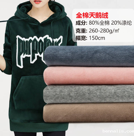 全棉天鹅绒:布料成分是80%棉+20%涤纶,它的克重和幅宽分别为280g/m²和160cm,布料微弹柔软,棉含量大且不易起毛,适合卫衣、卫裤以及毛毯的制作,布料批发的价格为35块钱每米。