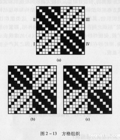 图2-13所示的方格组织其特点是处于对角位置的两部分配置相同的组织。组织图中左下角和右上角位置的组织为1/3右斜,右下角和左上角位置的组织为3/1左斜。绘制这类方格组织时,应注意分界处界线分明,即分界处相邻两根纺纱线的组织点必须为“底片翻转”的关系。此外还要注意对角线的两相同组织的组织点应连续,使织物外观整齐美观。从图2-13中可看出(a)、(b)符合上述要求,而(C)却不然,这是由于绘制组织图的起始点不同而形成的。图中(a)和(b)比较则(b)为更好,其不但布面花纹连续,且布面较(a)平坦,这是因为图(a)的组织图中在四个等分组织的共同交界处(即完全组织的中心)出现组织点呈b平纹组织,则交错较紧密,使布面中心有下凹的现象产生。