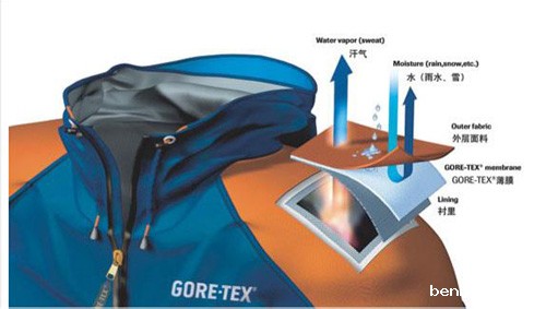 美国高尔公司的一和荷公司的是目前公认的“防水透湿”代表产品。一薄膜主要是由聚四氟乙烯以下简称双向拉伸微孔薄膜构成,厚约拜,开孔率为,孔径为拜,约为水滴的,比水蒸汽分子大倍,其耐水压可达,透湿量大于,·,透气量小于“·,因而具有良好的防水、透湿、防风功能。薄膜是由亲水的聚醋嵌段高聚物制成的没有微孔的实心体,厚度仅为如,具有重量轻,手感柔软和水蒸汽由里向外扩散距离短等优点。用在运动服和休闲服上是强劲的,而一在户外及恶劣气候服装上能满足更多要求。