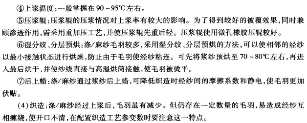 (3)纺纱线捻度:为了减少纱条毛羽,提高成纱完洁度,增加纤维间的抱合力,纱的捻度可适当提高,一般超过临界捻系数10%左右。同时也提高了织物的挺括度。