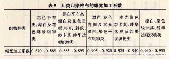 原色棉布经印染整理后,其幅缩率也随织物品种和染整工艺而定,有效宽度整理系数约在0.87~0.95之间。