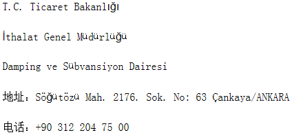 调查机关(土耳其贸易部)联系方式: