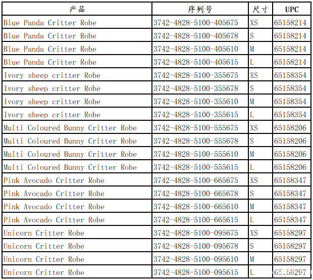 更多详情参见:https://recalls-rappels.canada.ca/en/alert-recall/urban-kids-plush-critter-robes-recalled-due-flammability-hazard#tablefield-node-63726-field_affected_products-0