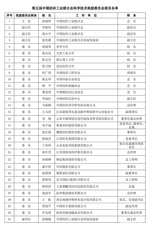 12月20日,2022年度中国纺织工业联合会科学技术奖励委员会工作会议采取线上和现场相结合的方式召开。中国纺联会长孙瑞哲、副会长李陵申,中国工程院院士俞建勇、夏长亮、陈文兴等领导和委员30余人参加了会议。会议由李陵申主持。