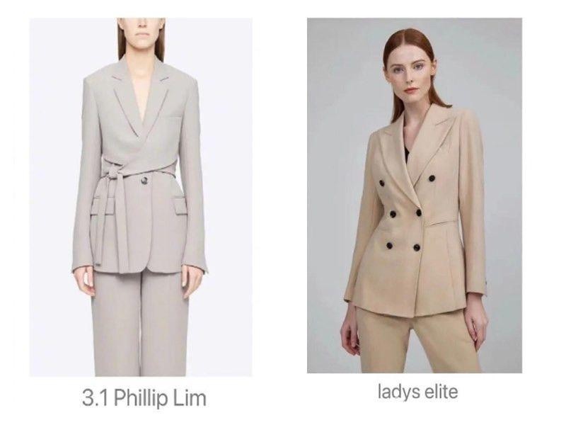 灰西服设计方案别具一格,腰部的阴茎系带尤其突显腹部线框,显得干净利索精美。米色的西装套装也十分干净利索,双排扣设计方案,让西服不那麼简单,很有设计感。