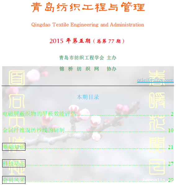 由青岛市面料工程学会主办、面料网协办的《青岛布料工程和治理》电子期刊于2009年1月正式创刊。该刊由青岛市面料工程学会秦志强工程师任主编。该刊除以电子邮件形式发送至会员单位外,还在布料网开设特意窗口供业内人士进行扫瞄和查阅。该刊的创办定能为广大布料业技术人员提供1个技术交流平台,为我国面料业技术创新起到积极作用。