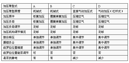 目前国内外生产的牵伸加压摇架共有四种即圈簧机械式加压摇架、板簧机械式加压摇架、直接式气动加压及集中式气动加压。: