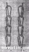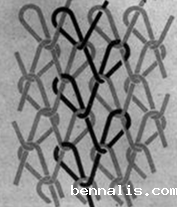 每根经纱始终绕同一枚针垫纱成圈,形成一根连续的线圈链,分开口编链和闭口编链两类。编链组织结构紧密,纵向延伸性小,不易卷边。一般和其他组织层压织成针织物物,可以限制织物纵向延伸性和提高尺寸稳定性。