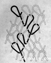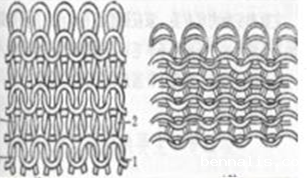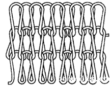 在经平组织中,同一根纺纱线所形成的线圈交替排列在相邻两个纵行线圈中。织物的正反面都呈现菱形的网眼,由于线圈呈倾斜状态,织物纵、横向都具有肯定的延展性。它大的缺点是逆编结方向简单脱散,当一个线圈断裂时织物易沿纵行分别成两片。