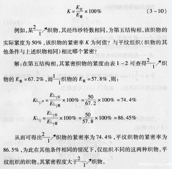 紧密织物是经纬纱在织物内的排列可能达到的大紧密情况,但在实际织物中,一般是达不到如此程度的,为了确切地比较各种实际织物的紧密程度,提出以紧密率K来表示,其含义即:实际织物的紧度E实对该组织相同结构相时的紧密织物的紧度历紧之比值。计算公式如下: