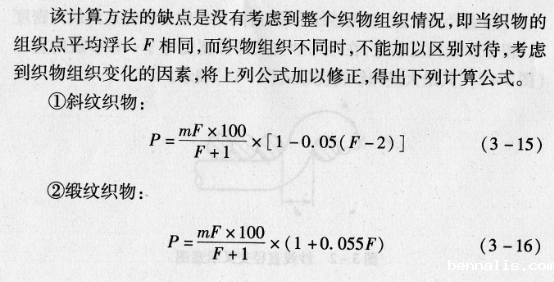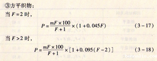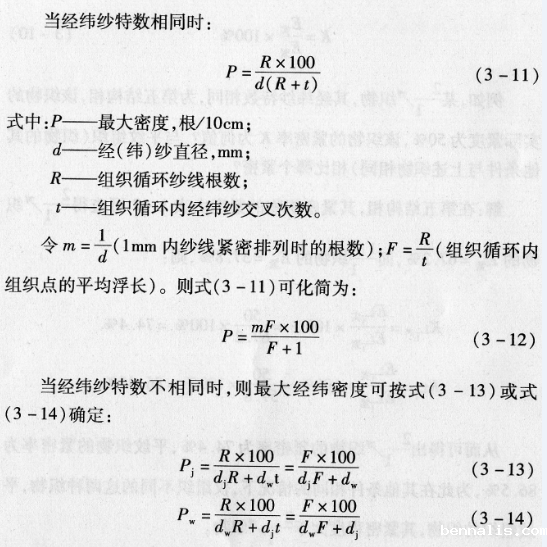 (1)紧度法:利用紧密织物紧度的公式求出织物的大紧度和密度[式(1-15)~式(1-17)]。达到紧密织物紧度时的密度为大理论密度以Pjmax(经向大理论密度)和Pwmax(纬向大理论密度) 表示。
