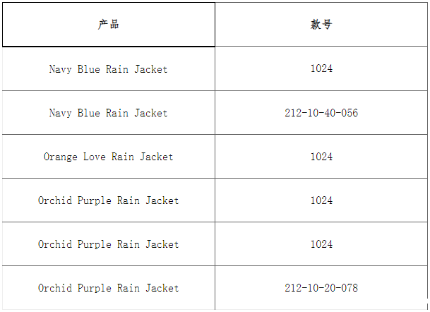 此次召回产品为KattnakkenJunior儿童防雨夹克。产品外部为聚氨酯针织物,内衬由聚酯衬里制成,带有拉链、可调节风帽、按扣、反光面等。尺寸适合5-12岁儿童。具体召回产品信息如下: