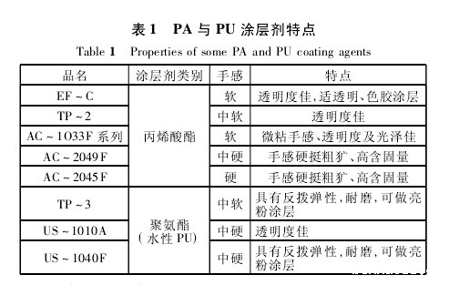 聚丙烯酸酯类(PA)和聚氨酯类(PU)涂层剂是目前常用的涂层剂。PA涂层剂具有黏着力强,不易泛黄,透明度高,共容性好和成本较低等优点,可生产有色涂层产品。其产品耐日光、耐气候牢度和耐洗性好,但存在织物弹性差、易折皱,表面光洁度差,手感欠佳等缺点。PU涂层剂具有柔软、弹性好、涂层强度高、耐磨、耐湿、耐低温和耐干洗等特点。如果在涂层上进行微孔加工,织物还能兼备防风、防水和防污性能,且透湿和透气性好,但其成本较高,耐气候性差,遇水、热、碱会发生水解等问题。表1列出了PA和PU涂层的主要特点。