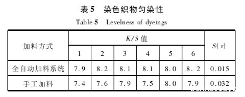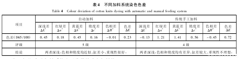 表4表明,自动加料系统由于称量精确和加料均匀稳定,减少了人工称量误差,由此避免了由人为操作引起的缸差,使织物具有较高的符样率,染色重现性比传统后工加料好,提高了染色一次成功率和产品质量。