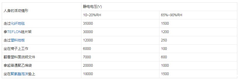 在没有进行防静电治理的生产环境里,电子工厂人员日常工作的产生静电强度和湿度的关系如表-1所示。