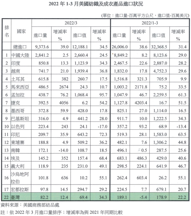 附件:2022年1-3月美国纺织及成衣产品进口状况