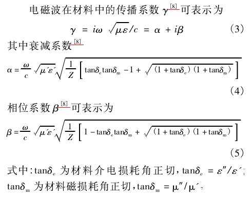 将不同比例的吸波剂( 乙炔炭黑,羰基铁) 加入稀释剂 DMF-甲苯和分散剂 OP-7 中,用 JB500D 电动搅拌机搅拌 10 min,加入黏结剂 PU( 固含量为30% ) 再用电动搅拌机以 1 500 r / min 的速度搅拌60 min,制成吸波涂料。将不同比例吸波剂的吸波涂料调至适当黏度,利用涂层小样机在铜镍镀层布和金属纱线混纺织物上涂覆相应的厚度,在 HD101A 电热鼓风烘箱内固化。多次涂覆以达到理想厚度,即得所需的吸波涂层面料。设计的单 层 吸 波 体 的 结 构 模 型 如 图 1所示。模型中基布作为电磁波屏蔽材料,视为理想导体,使得基布和涂层边界只有反射而无透射。吸波涂层面料吸收电磁波的基本要求是满足阻抗匹配原则和大化衰减原则,输入阻抗公式是建立在基布图 1 吸波涂层面料结构模型可被看作理想导体的前提下的,根据电磁波传输理论,单层吸波材料与空气形成界面的反射率 式中: d 为吸波材料的厚度; λ0为电磁波在真空中的波长或电磁波在自由空间的波长; ε'和 ε″为相对复介电常数的实部和虚部; μ'和 μ″为相对复磁导率的实部和虚部。电磁波在材料中的传播系数 γ利用式( 1) ~ ( 5) 吸波体传输线理论和多目标优化计算的方法,开发了吸波材料的优化设计软件,可在软件中导入吸波粉体和黏结剂电磁参数 ε'、ε″、μ'、μ″建立数据库,输入预期的涂层厚度、层数和损耗介质混比。