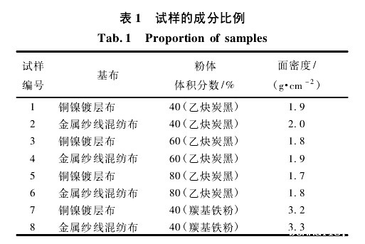 于名讯等以仿抄纸装置及湿法纺织工艺,制备厘米波/毫米波兼容隐身湿纺织物,研究了隐身湿纺织物在 8 ~ 12 GHz 和30 ~ 40 GHz 频段的吸波性能。E. Tan 等讨论了以陶瓷纤维为基布,碳化硅为基体的不同组合的多层织物和不同氧化程度对织物吸收电磁波能力的影响,认为在千兆赫范围内,织物有很好的减少反射和传递的效果,可吸收 90% 以上的电磁波。针对铁纤维的吸波性能和可纺性能,研究了其微观形态、力学性能及摩擦性能,预测铁纤维吸波材料顺利纺纱的可操作性。本文以铜镍镀层布和金属纱线混纺布为基布,利用其面密度低,厚度薄,柔性好等优点,通过在基布上涂覆吸波剂,重点研究了吸波粉体混比的变化及基布对涂层面料吸波性能的影响。