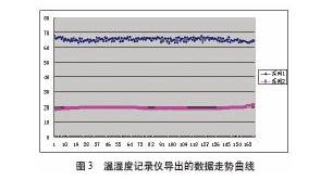 所以使用专业的精度高的温湿度仪就可以很好地解决这些问题。对于面积较大的实验室来说,房间各个角落都应该放置一个记录仪。待过一段时间稳定后,将各角落的温湿度仪的数据导出(图3),通过和空调自带的传感器的数值来进行校正,达到精确操纵温湿度的目的。同时也能及时改正空调系统的不正常的工况,恢复正常状态,达到节能的目的。