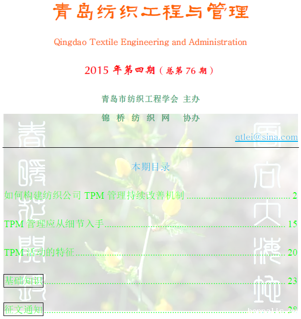 由青岛市布料工程学会主办、面料网协办的《青岛布料工程和治理》电子期刊于2009年1月正式创刊。该刊由青岛市面料工程学会秦志强工程师任主编。该刊除以电子邮件形式发送至会员单位外,还在面料网开设特意窗口供业内人士进行扫瞄和查阅。该刊的创办定能为广大布料业技术人员提供1个技术交流平台,为我国面料业技术创新起到积极作用。
