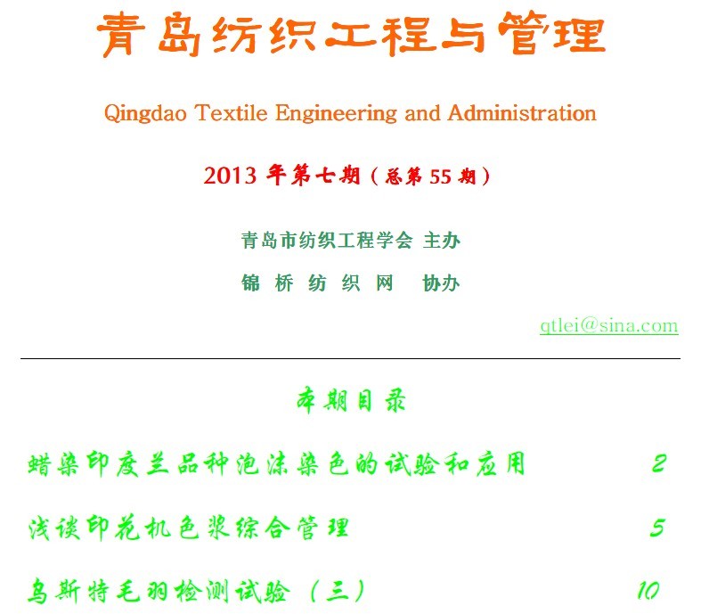 由青岛市布料工程学会主办、面料网协办的《青岛面料工程和治理》电子期刊于2009年1月正式创刊。该刊由青岛市面料工程学会秦志强工程师任主编。该刊除以电子邮件形式发送至会员单位外,还在面料网开设特意窗口供业内人士进行扫瞄和查阅。该刊的创办定能为广大面料业技术人员提供1个技术交流平台,为我国面料业技术创新起到积极作用。