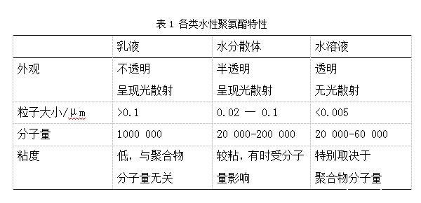 根据分子粒子在水中的分散程度不同,水性聚氨酯分为乳液、水分散体、水溶性等3种,表1列示了3种水性聚氨酯的特性。
