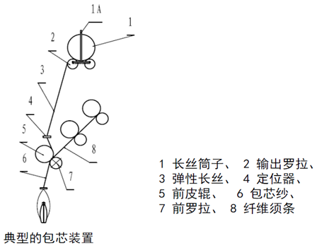 以长丝为芯,短纤维为皮的包缠结构的纱,属贴合纱。可在环锭纺纱机或捻线机,转杯纺,涡流纺,尘笼纺,自捻纺上实现。