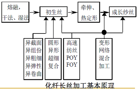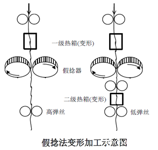 空气变形纱:将稍有捻度的长丝束超喂送入高压喷气头,由于射流的冲击,丝束中纤维紊乱生成大小不同的环圈,被丝束捻回夹持于丝束中成纱。