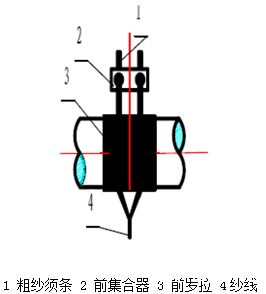 原理:将2根粗纱以肯定间距平行引入细纱机牵伸区内,同时牵伸,并在集束三角区内汇合加捻形成单纱,须条和纱均有同向捻度。