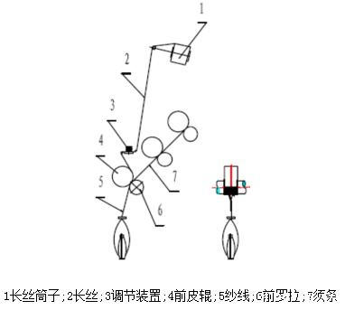 原理:由一根经牵伸后的须条和一根不经牵伸但具有肯定张力的复丝在加捻三角区层压加捻形成的层压纱。