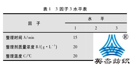 1.3复合整理方法采用两浴浸渍法对试验用针织物依次进行抗菌和防紫外整理。抗菌整理工艺如图1所示。防紫外整理工艺:加入防紫外剂,在一定整理剂质量浓度、整理时间和整理温度下浸渍后,脱水烘干。为探讨基于抗菌整理工艺的防紫外整理工艺对整理效果的影响,以整理时间A(min)、整理剂质量浓度B(g/L)和整理温度C(℃)为3个主要因素,进行3因子3水平正交试验,优选防紫外功能整理工艺参数,因子水平如表1所示。2性能指标和测试方法经防紫外线单因子试验分析可知,防紫外整理工艺对织物的防82紫外线性能、透气性能和悬垂性能影响较大,因此选取紫外线防护系数(UPF)值、透气率和悬垂系数这3项指标进行试验比较。