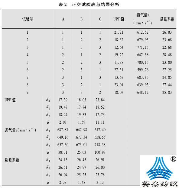 2.3悬垂系数采用XDP-1型织物悬垂性能测试仪,参照FZ/T01045—1996,测试织物(直径为24cm的圆形试样)的悬垂系数。悬垂系数小,说明织物柔顺,即悬垂性能好;悬垂系数大,说明织物硬挺,即悬垂性能差。2.4抗菌性能参照FZ/T73023—2006,由CTTC对织物试样进行AAA级(即经50次洗涤后)抗菌性能测试与评价,其中菌种的参照标准为ATCC6538(金黄色葡萄球菌)、ATCC8099(大肠埃希菌)和ATCC10231(白色念珠菌)。3试验结果与分析整理剂质量浓度A、整理时间B和整理温度C与紫外线防护系数UPF值、透气量(mm/s)及悬垂系数之间的关系的正交试验结果及分析如表2所示。