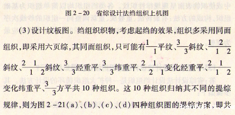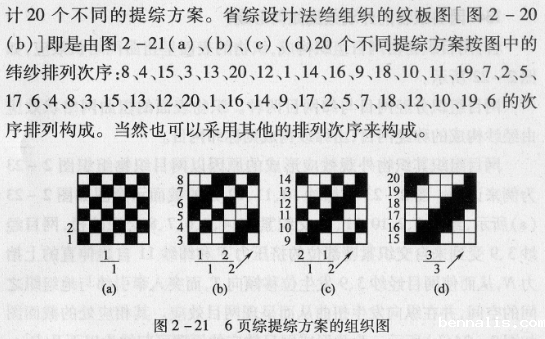 (1)确定采纳的综页数。为使生产顺利进行综页数不宜过多,常用6页或8页两种,现以6页为例,图2-20为省综设计的绉组织上机图。