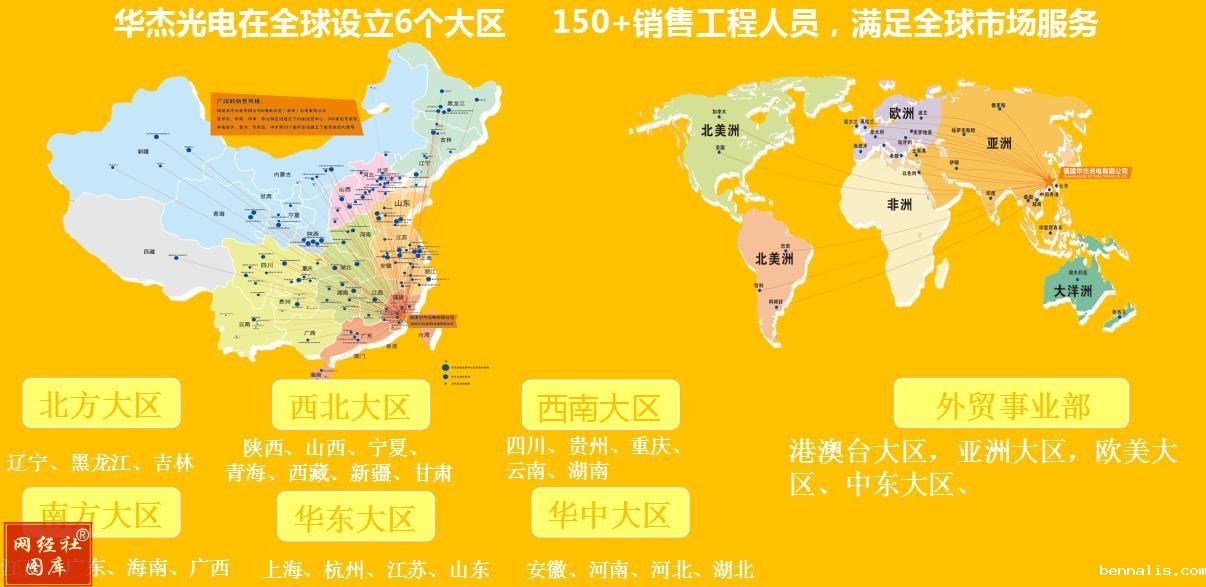 华杰光电在2012年正式成立海峡彩亮光电产业园,并在华东、华南、华中、华北等区域建立了近百家省级经销商,满足了新疆,内蒙、宁夏、西藏、青海偏远地区对显示屏的需求。华杰拥有2000多家线下展厅,并在东南亚、欧洲、美洲、中东等35个国际区域建立了数百家的代理商。其中在土耳其、俄罗斯、伊朗、迪拜、英国、荷兰、新加坡等区域的业务成为华杰进军国际市场重要战略布局。