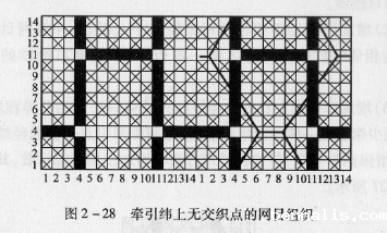 方法2:以单起平纹组织为基础,选定问隔5根经纱以上的奇数经纱(或偶数经纱)改作网目经纱,选择问隔7根纬纱以上的偶数(或奇数)纬纱改作为牵引纬纱,在网目经纱上增加经组织点,除牵引纬上为纬组织点外,全部改为经组织点,为网目经纱突出在织物表面制造条件,在选定的牵引纬纱上,相问地去除两组网目经纱之间的交错点,使网目经纱两侧的地部交错松紧差异增大,为网目经纱左右扭曲构成网目效应制造条件。其情况如图2-29所示。