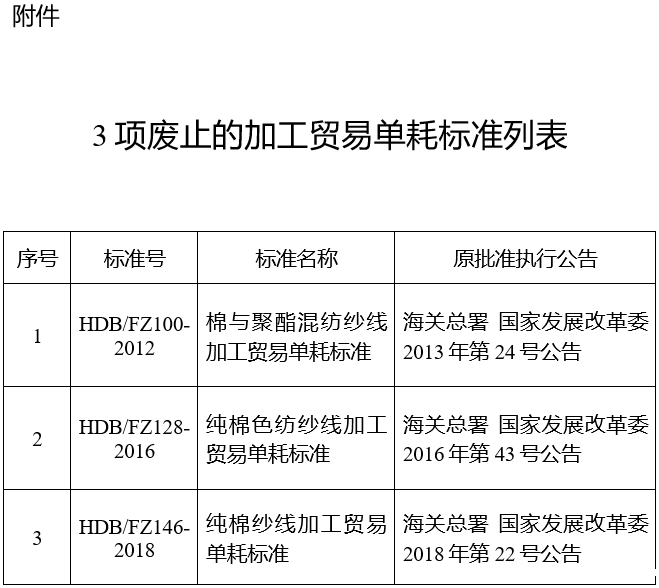 自2021年2月4日起,《棉与聚酯混纺纱线加工贸易单耗标准》(标准号:HDB/FZ100-2012)等3项加工贸易单耗标准(标准名称见附件)予以废止。